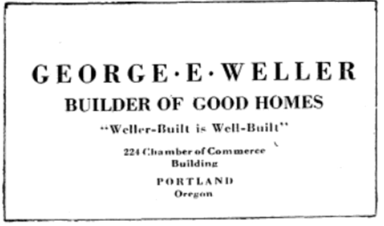 An article in the May 4, 1924 edition of The Oregonian lists Weller as the president of Pacific Building Company and identifies several properties built by the company. Weller does not appear to be a company owner, but rather a contractor who built houses on behalf of company owners, even while he was running his own homebuilding business as Builder of Good Homes.