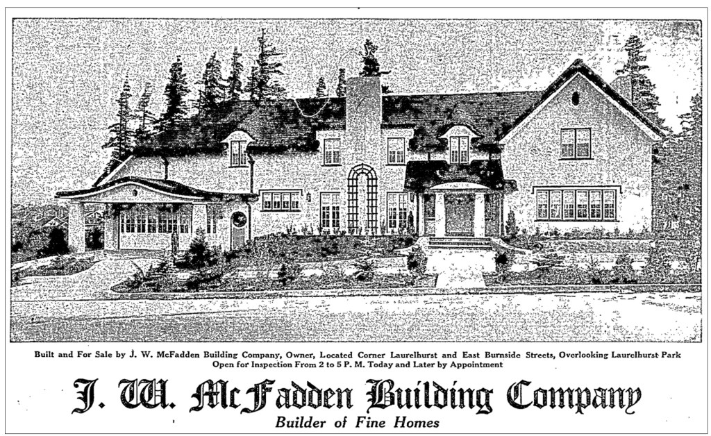 By the late 19-teens, McFadden had scaled up his business to produce hundreds of homes in Rose City Park, Laurelhurst and in southeast Portland. As a builder/owner, his method was to purchase a large number of lots in desirable new eastside subdivisions that he would then build and sell, mostly on speculation. In essence McFadden was both builder and realtor. Over time, his work progressed from small bungalows to larger homes. The tag line in his newspaper ads read: “If McFadden built it, it’s all right. Builder of fine homes.”