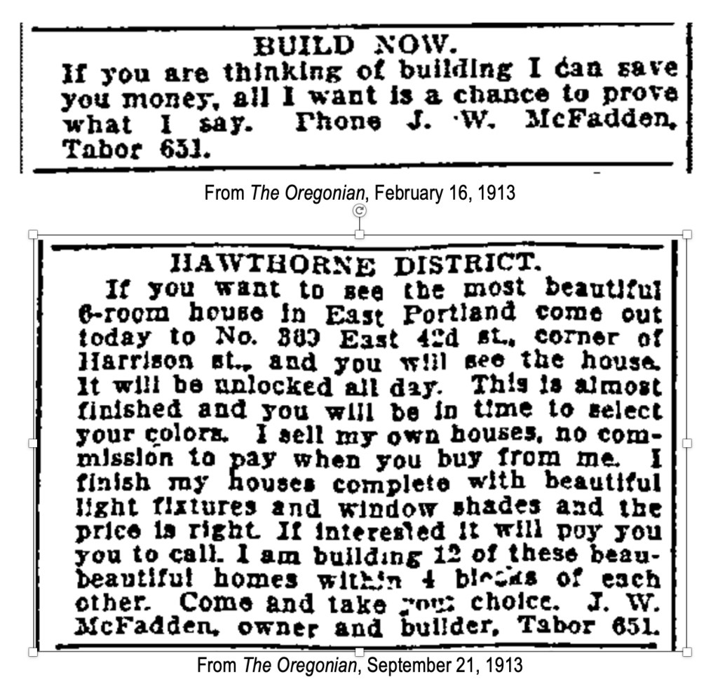 John Wesley McFadden was born in Big Creek, Kentucky on December 1, 1881. He came to Oregon in 1901 as a carpenter and lived briefly in Vancouver. By 1913, he was back in Portland, living with his second wife and step-daughter and starting out on his own as an independent homebuilder, focused on building small bungalows in southeast Portland: