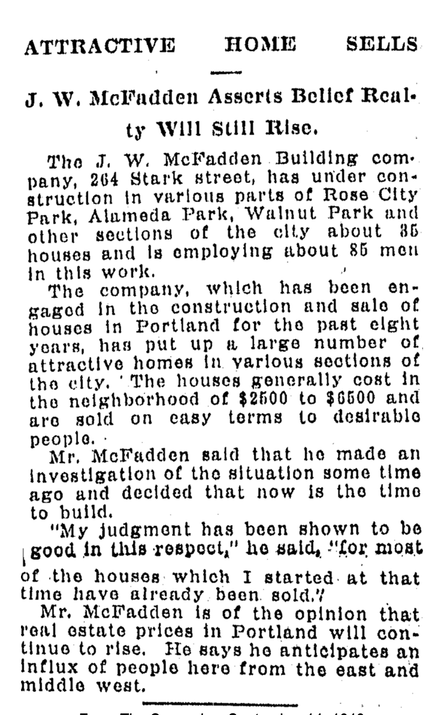 By the late 19-teens, McFadden had scaled up his business to produce hundreds of homes in Rose City Park, Laurelhurst and in southeast Portland. As a builder/owner, his method was to purchase a large number of lots in desirable new eastside subdivisions that he would then build and sell, mostly on speculation. In essence McFadden was both builder and realtor. Over time, his work progressed from small bungalows to larger homes. The tag line in his newspaper ads read: “If McFadden built it, it’s all right. Builder of fine homes.”