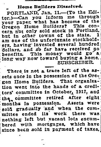 Early 1917 saw an increase in the number of stockholders who were selling off large blocks of OHB shares by confidential blind box classified ads in The Oregonian. The county’s annual tax delinquency list published in February identified 15 OHB properties owing taxes dating back to 1915. And OHB’s “for sale” classified ads shifted away from homes and city property to agricultural acreage in the Willamette Valley and Montana. Something was clearly going on. And then this in a May 2, 1917 advertisement, as if to staunch any whispers: