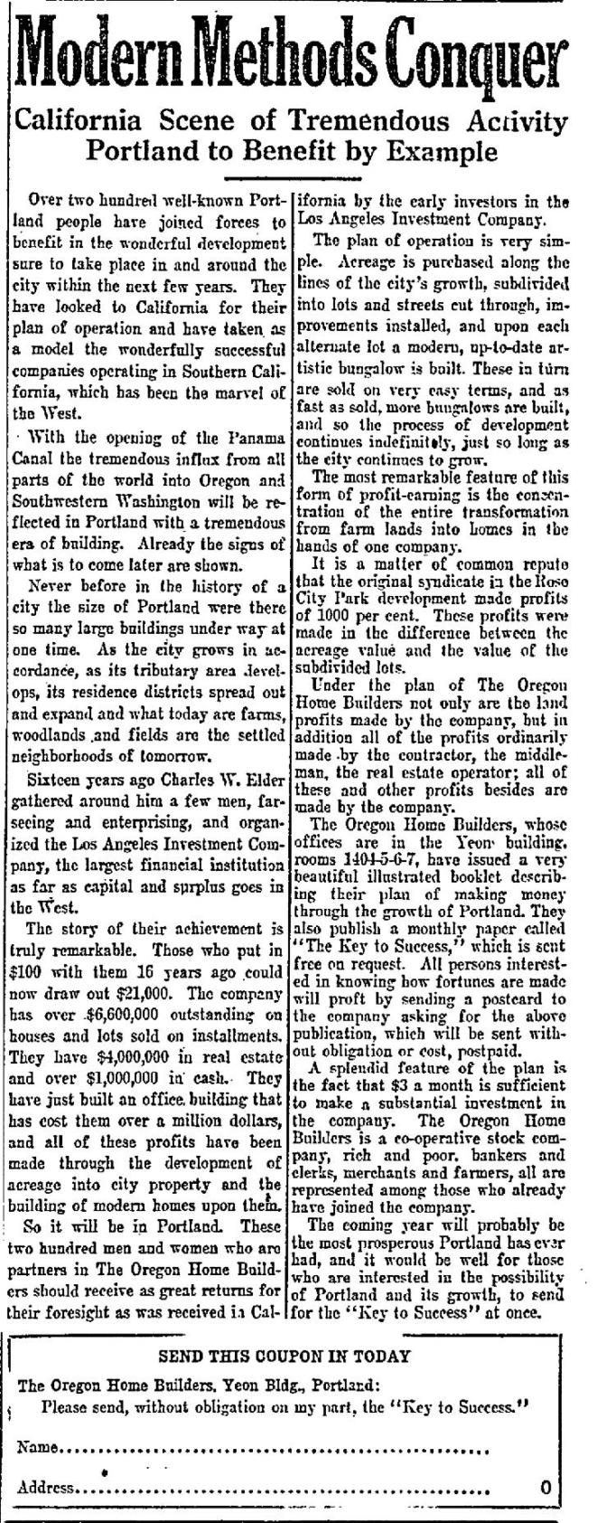 “Early in the year 1912, a number of successful Portland business men, confident of the wonderful future of the metropolis of the Pacific Northwest, organized The Oregon Home Builders for the purpose of purchasing, developing, sub-dividing and selling real estate in and around the city of Portland and to finance and build modern homes on its own tracts for sale on monthly payments like rent… to participate in the golden harvest to be reaped in Portland through its certain growth, prosperity and development within the next few years.”