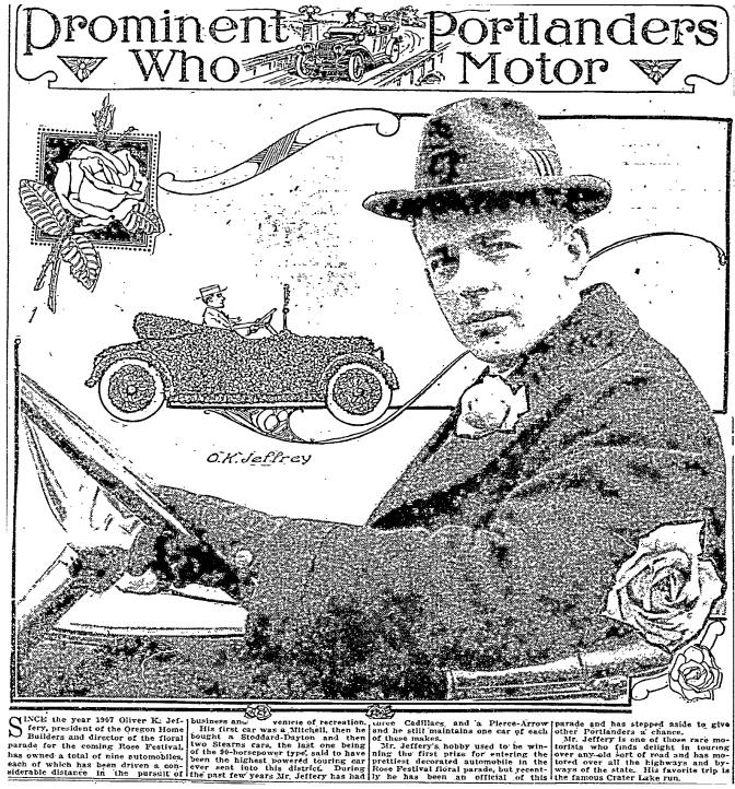1916 was evidently a successful time for Jeffery personally as well. A series in The Oregonian called “Prominent Portlanders Who Motor” featured information about his personal vehicles and association with the Rose Festival parade: