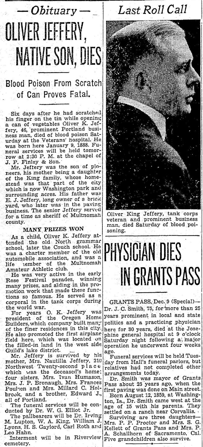 Two years later he entered the mortgage business, opening a company called First Bond and Mortgage, which did not survive the Great Depression. By then—after the divorce and another brief marriage that ended in divorce—he moved in with his mother Nautilla in a big house in Northwest Portland where he lived for more than a dozen years—referred to as a “capitalist” in business directories—until his death at age 46 in December 1936.